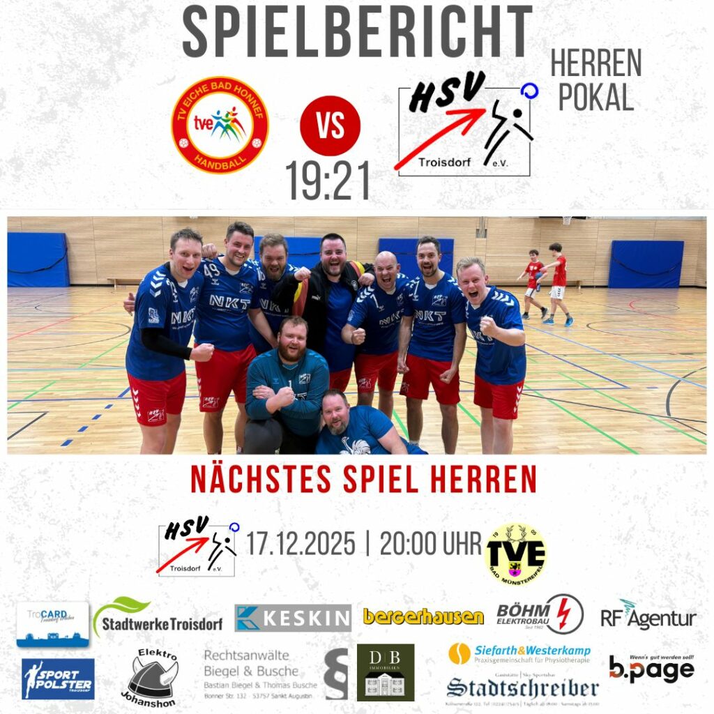 Beim Auswärtsspiel in Bad Honnef siegen die Herren des HSV Troisdorf in einem spannenden Pokalachtelfinale gegen den TV Eiche 02 Bad Honnef 21:19 (12:13).