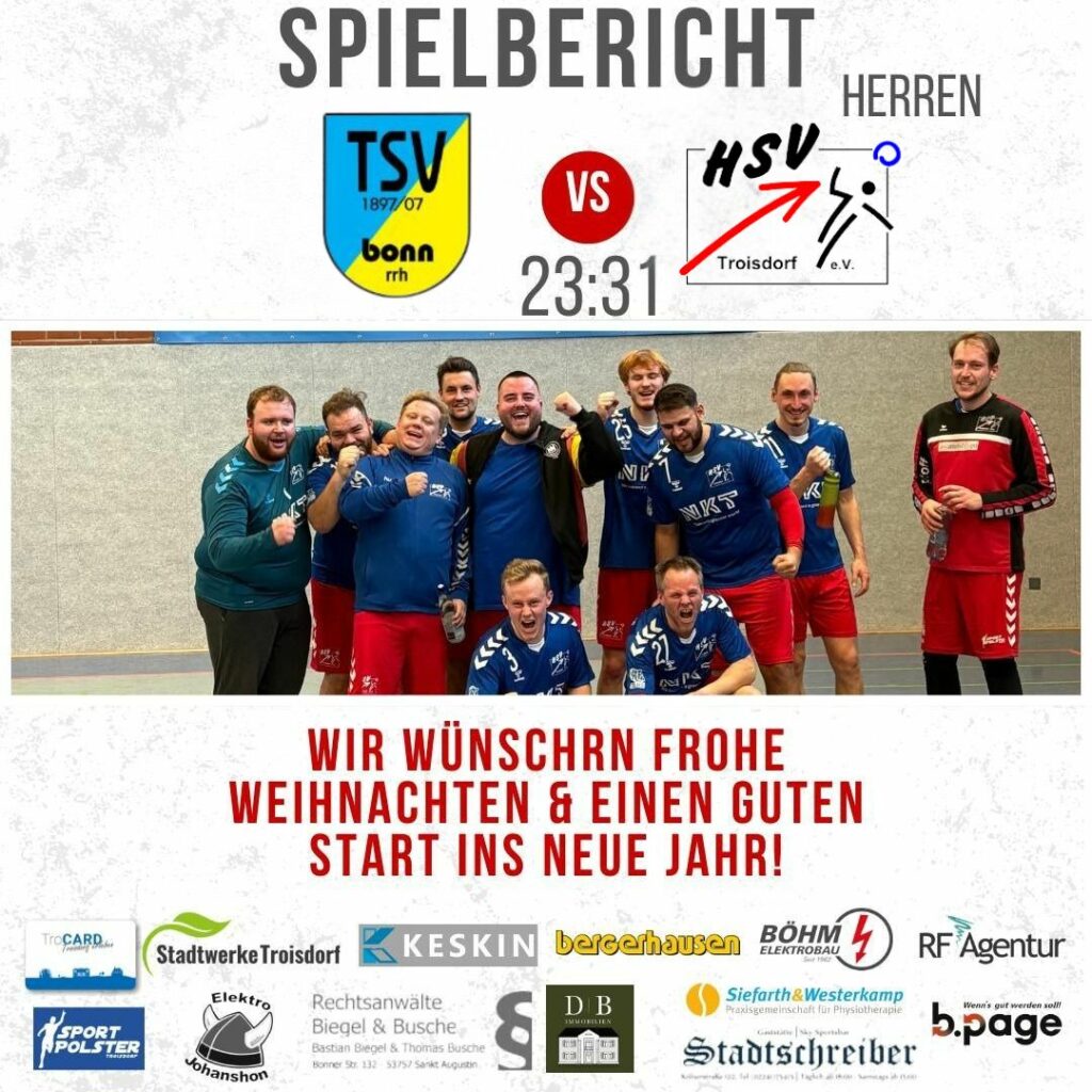 Mit einem überzeugenden 31:23-Auswärtserfolg beim TSV Bonn rrh. IV hat sich der HSV Troisdorf am Sonntag, 21.12.2025, erfolgreich in die Winterpause verabschiedet. Im letzten Spiel vor Weihnachten und dem Jahreswechsel zeigte das Team eine konzentrierte und geschlossene Mannschaftsleistung und setzte damit einen starken Schlusspunkt unter das Handballjahr 2025.